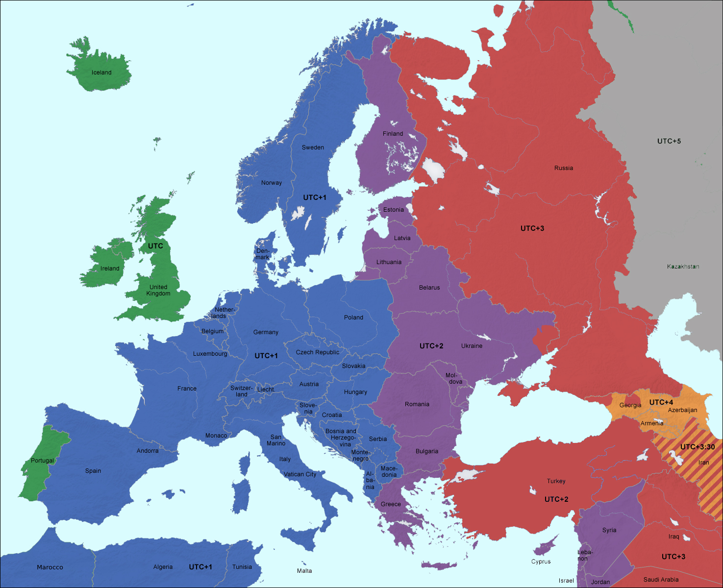 Map Of European Time Zones. Switzerland follows the same schedule although the country is not part of the EEA. It includes all countries in the European Economic Area (EEA), except Iceland. The name of each time zone changes along with the Summer Time.